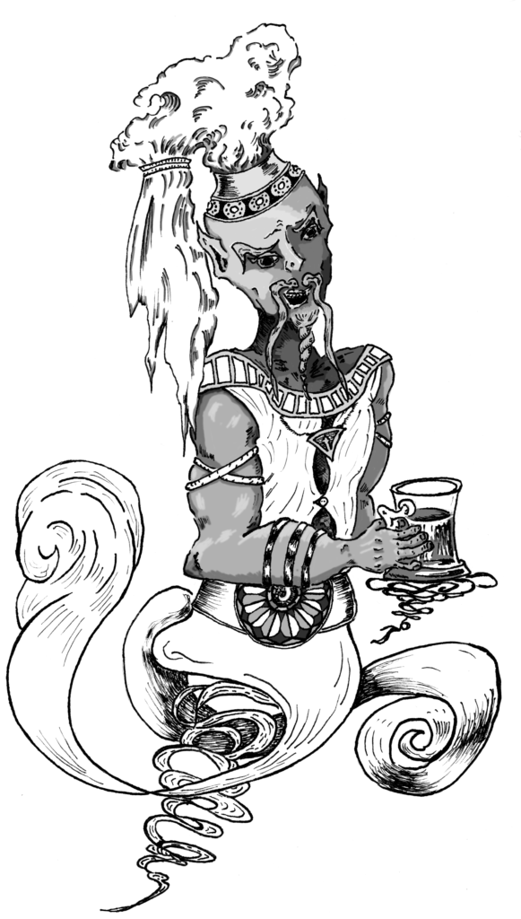 Who but be I say you? Excuse the flamboyant attire, I assure you I am kind and make no pretense to deceive. Yes, a Djinni my mass is made mostly of hot air, let not that be said about my speech! From whence I came was a stuffy Djinni court, not to my predeliction. Freedom I sort, knowledge I gained, and of course the most delictable ciders of the land. Now this building and its tenants flitter from land to land, sometimes here, sometimes there. Always a tall tale to be had.